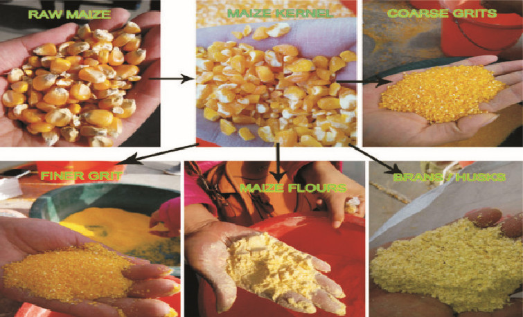 This machine set is a combination equipment which consists of corn peeling, corn polishing, corn grits and flour making, end products classifying and winnowing. The clean raw grain is conveyed to the feeding inlet for peeling, degermination and black impurities removing and can be processed into corn kernels once. After smashing and mixture grading, the machine can produce three end products: medium grits, small grits and corn flour. Inside of the machine has highly efficient air draft chamber for collecting the corn skin from peeling process and further cleaning micro powder and micro impurities in the corn grits.